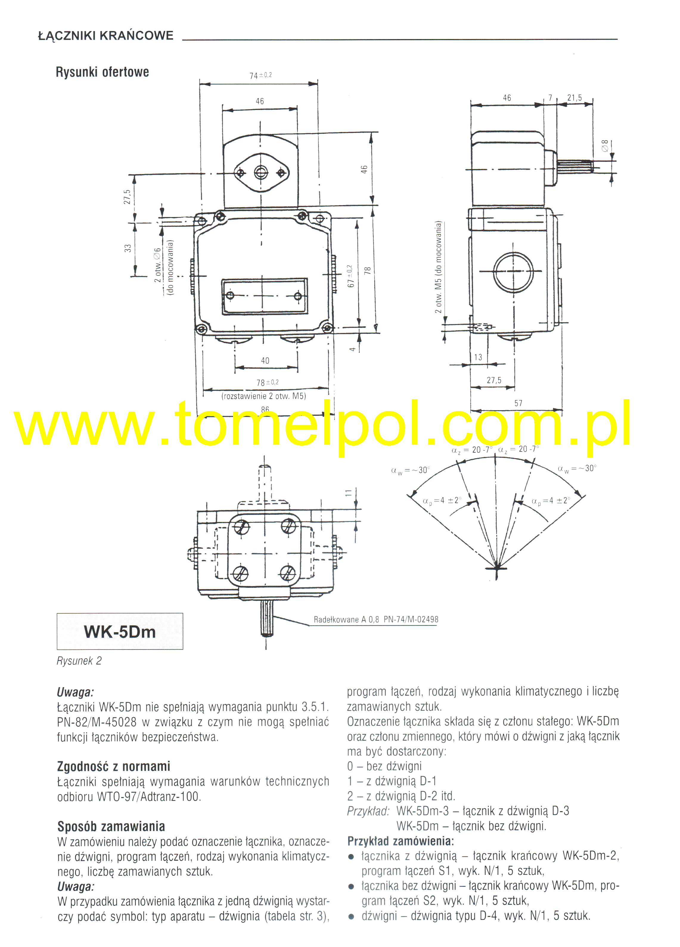 Łącznik krańcowy WK-5DM jest przeznaczony do pracy w obwodach sterowniczych prądu przemiennego i stałego. Stosowany jest do sygnalizowania położeń maszyn i urządzeń poruszjących się po określoych torach.